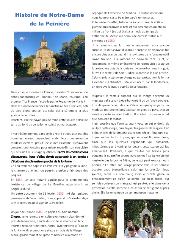 Vers 1580, dans le village de La Peinière, près de Châteaubourg, un paysan retire des ruines d’un ancien ermitage une statuette de la Vierge. Il la dépose précieusement auprès de la fontaine non loin de là. Les habitants qui viennent puiser de l’eau à la source prennent l’habitude de prier devant la statuette. Rapidement, une grotte en forme de four est construite pour l’abriter. Celle-ci est remplacée par un oratoire en bois. Peu à peu, la dévotion populaire grandit. L’oratoire voit affluer, chaque année, un nombre croissant de pèlerins, particulièrement lors des fêtes mariales.