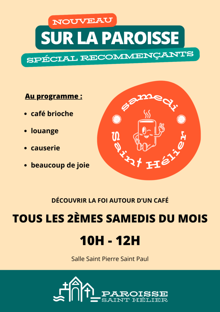 Une proposition conçue par nos prêtres de Saint Hélier, pour les recommençants, afin de donner à tous de découvrir la foi autour d’un café brioche, une petite louange, un temps de causerie, … ! Quoi de mieux pour un samedi matin ?