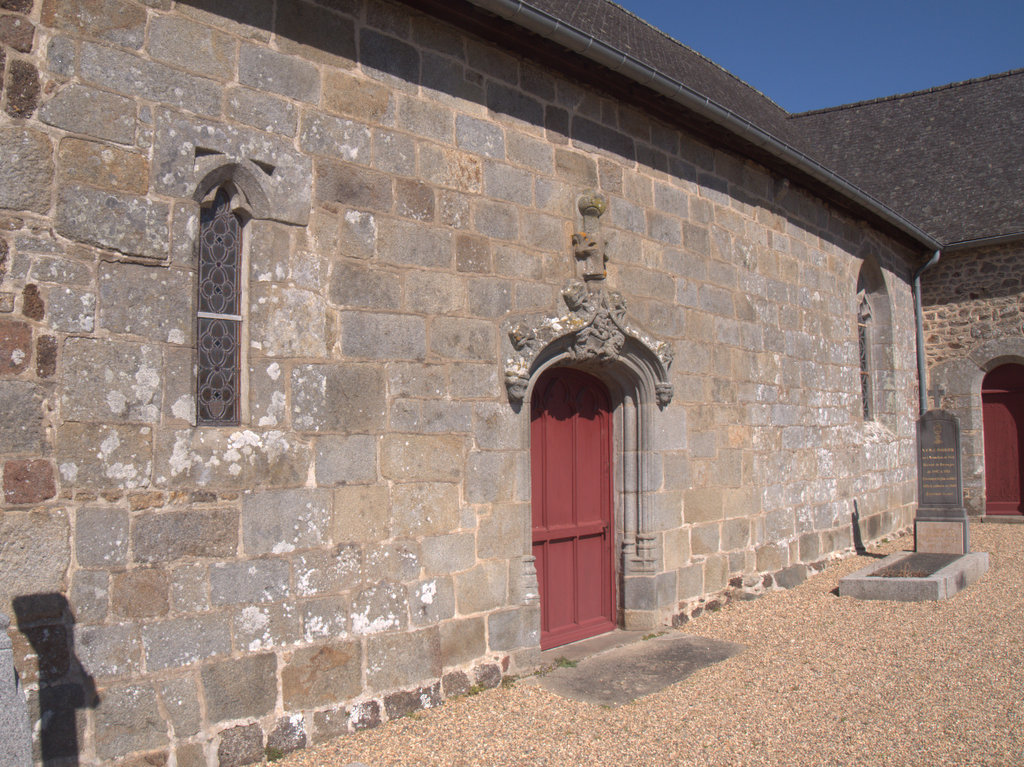 Elle est composée d’une nef à chevet droit du 16e siècle, d’une chapelle au sud avec clocher en façade en bas de nef. Sur deux portes de style flamboyant figurent les blasons des familles Bintin et Le Mintier, seigneurs de Bazouges du 14e au 18e siècle.
