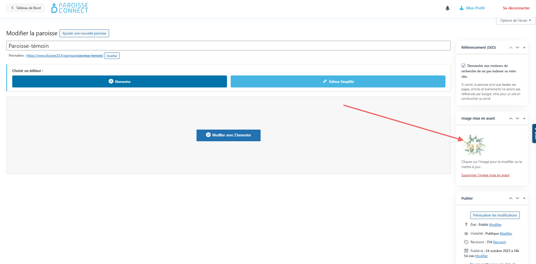 Ne cliquez pas sur Elementor ni sur Éditeur simplifié. Il suffit simplement de modifier l’image à la une de votre page d’accueil. Cela mettra à jour le logo sur l’ensemble du site.